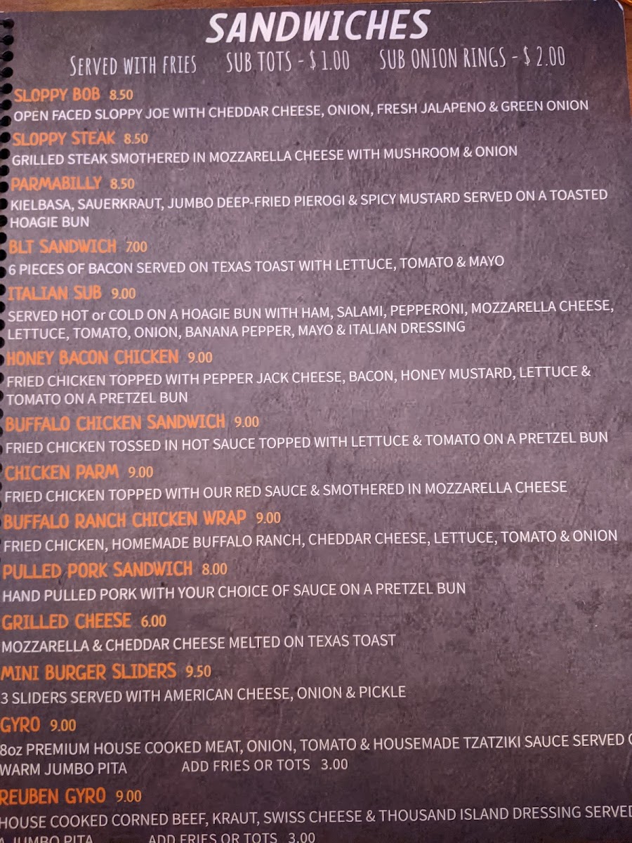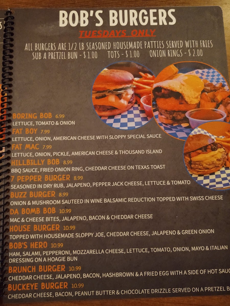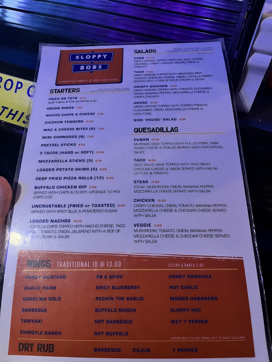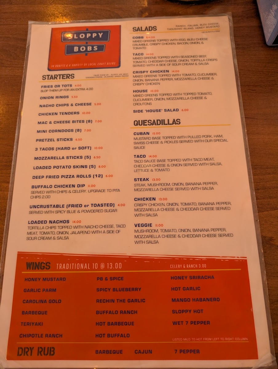 The menu features a mix of classic bar favorites and hearty dishes. You’ll find items like crispy chicken quesadillas and flavorful wings alongside more filling options such as the Sloppy Bob Sandwich—an open-faced sloppy joe topped with cheddar and jalapenos—or the Brunch Burger. Lighter choices like the Cobb Salad and sides like tater tots or fries round out the selection, while the pizza offerings keep things familiar and simple.