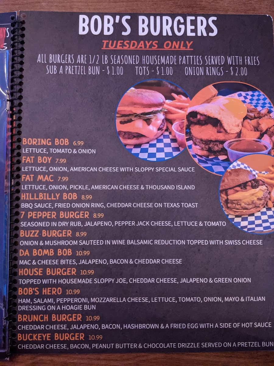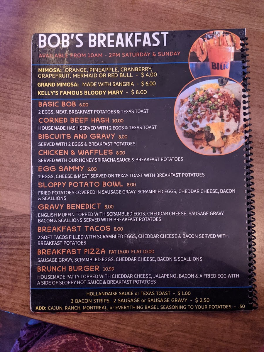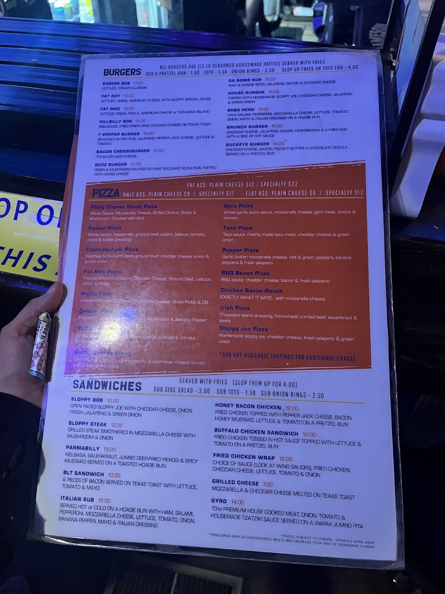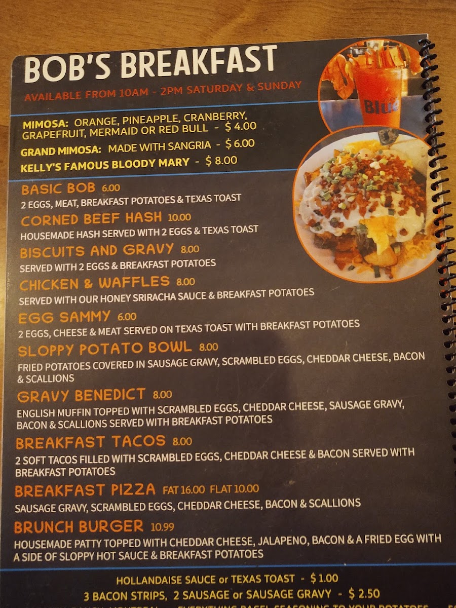 The menu features a mix of classic bar favorites and hearty dishes. You’ll find items like crispy chicken quesadillas and flavorful wings alongside more filling options such as the Sloppy Bob Sandwich—an open-faced sloppy joe topped with cheddar and jalapenos—or the Brunch Burger. Lighter choices like the Cobb Salad and sides like tater tots or fries round out the selection, while the pizza offerings keep things familiar and simple.